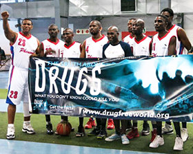 Sedan har vi basketlaget från Sydafrika kallat Phenoms, som visar en Drogfri värld-banderoll samtidigt som de kastar bollen i korgen och uppmuntrar sina fans att leva ett drogfritt liv.